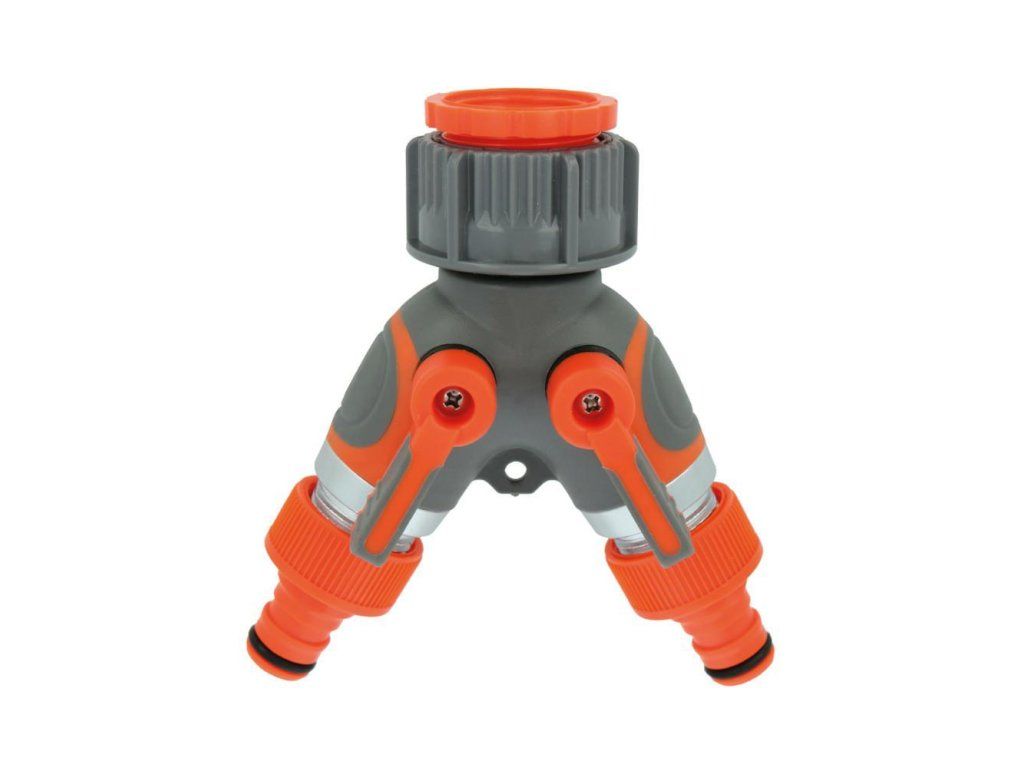 Rozdzielacz wody - dwójnik z zaworami mod. R05 Plus Niezastąpiony sprzęt do każdego ogrodu, funkcjonalny i precyzyjnie wykonany produkt. Złącze to przekształca jeden kran w dwa gniazda, co pozwala na równoczesne użycie dwóch akcesoriów. Każdy z kraników posiada własny zawór regulacyjny. Całość można montować na kranach 3/4". Rozdzielacz ten sprawia, że bez konieczności przerywania podlewania ogrodu można np. uzupełnić wiaderko wodą. Pozwala on również na jednoczesne podlewanie różnych części ogrodu. Produkt wykonany z najwyższej jakości, bardzo wytrzymałego tworzywa sztucznego (ABS), odpornego na pękanie i zarysowania z gumową obudową.