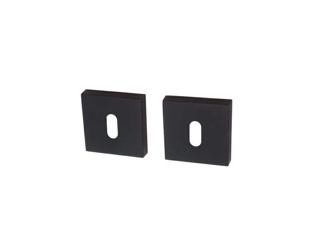 Komplet kwadratowych rozet na klucz mod. 201B - Wymiary rozet: 50x50x10mm - Materiał: zamak (rozeta zewnętrzna), tworzywo sztuczne (rozeta wewnętrzna) - Wykończenie: czarny mat - Montaż niewidoczny Każda z rozet składa się z dwóch części, rozety wewnętrznej montowanej bezpośrednio do drzwi, o wciskanej na nią rozety zewnętrznej