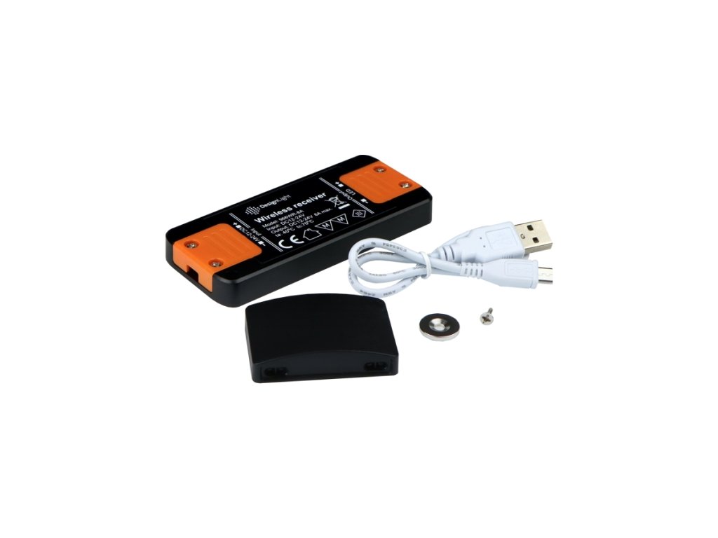 TEO sada – bezdrátový RF ovladač + přibližovací senzor se stmívačem (černá) slouží k bezdrátovému ovládání LED osvětlení na 12V DC nebo 24V DC v libovolném nábytku. Sada je předprogramovaná a funguje rádiově do 10 m.