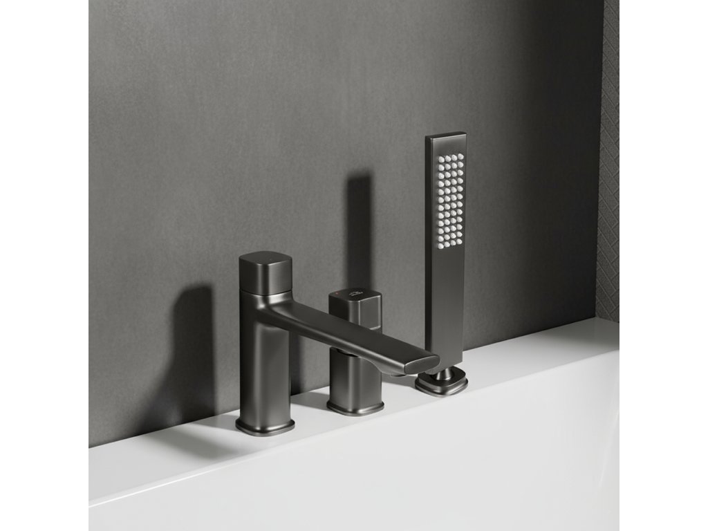 Jednopáková vanová baterie Tores v grafitu, stojánková 3-otvorová. Keramická kartuše 30 mm, NEOPERL + aerátor proti vodnímu kameni, dešťový proud, hadice se systémem proti kroucení, A ≤ 15 l/min, akustická I (≤ 20 dB).