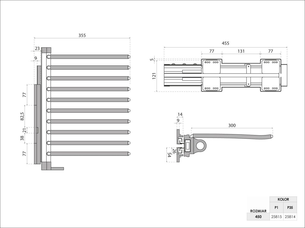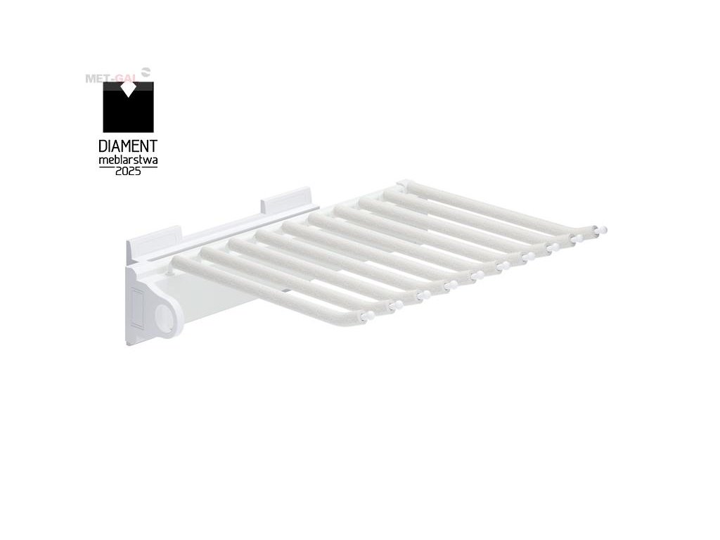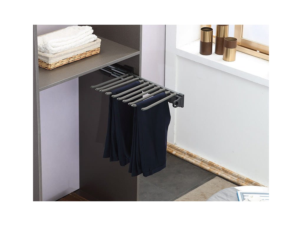 Výsuvný věšák na kalhoty do Metgal spojuje kvalitu a praktičnost. Věšák na kalhoty se pohybuje na plnovýsuvu s dotaham a tlumením. Výrobek se připevňuje na levou nebo pravou stranu skříně. Věšák má 10 míst na kalhoty. Jedná se o velmi praktický doplněk drátěného programu do šatní skříně, kdy umožňuje jak nejefektivněji využít vnitřní prostor šatních skříní.
