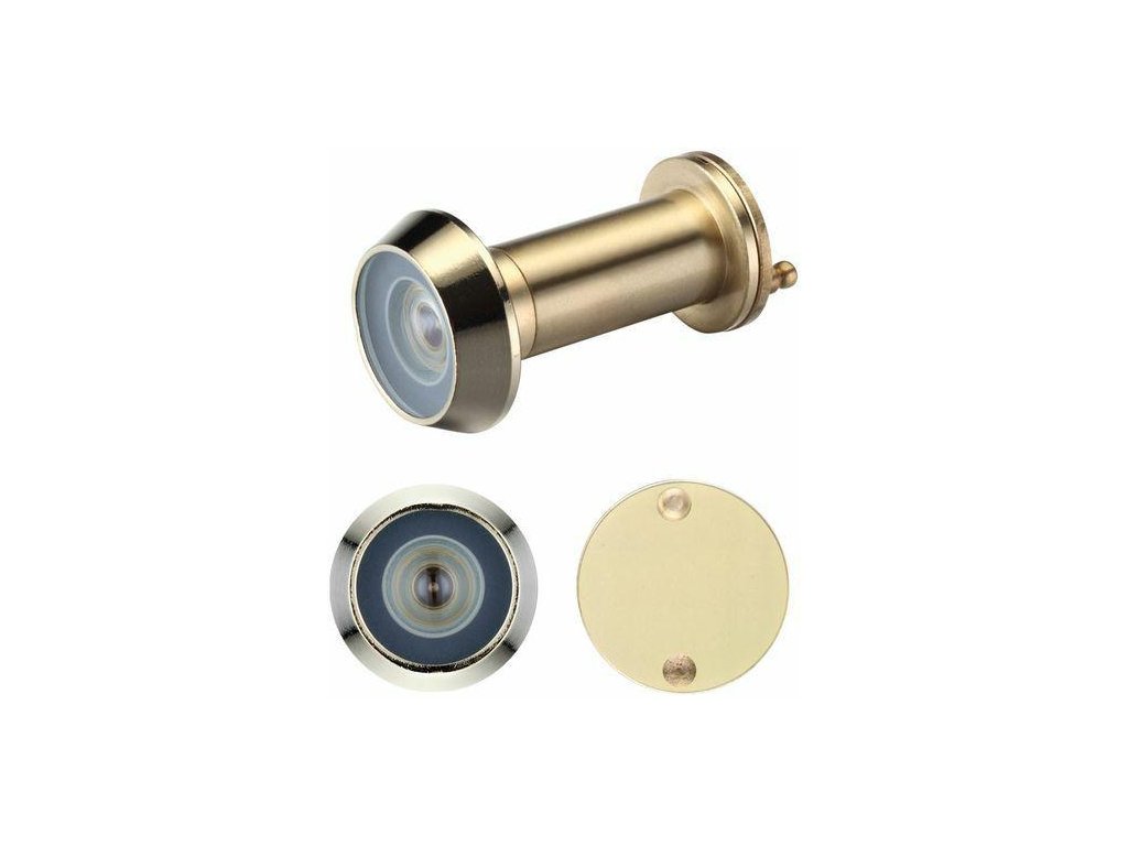 Kukátko mosiężny z tarczką zamykającą Specifikace: - Průměr otvoru montażowego: 14 mm – Pro dveře o tloušťce 35-55 mm – Materiál: mosaz – Povrchová úprava: mosaz mat – Široký úhel zorného pole (180°) - Soczewka: szkło Certyfikat p.poż BS EN 1634-1