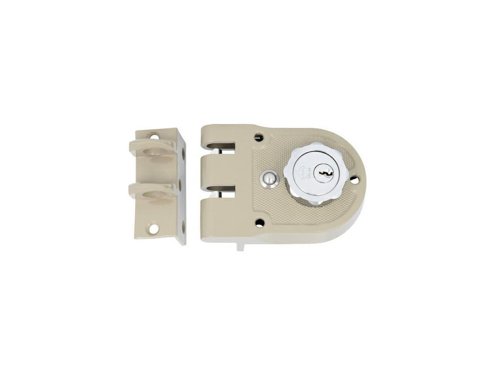 Přídavný zámek bubnový model 1396 - Verze: LEWA - Barva: béžový Zámek nawierzchniowy z vložkou vnitřní a vložkou vnější przypoužívaný do dveří o grubosaci od 30 do 60 mm Vložka zaopatrzona w 5 zapadek V sadě 2 klíče z mosazu niklovanégo Dwa rygle blokující z niklovanéj oceli a tlačítko blokující do těch rygli Osová vzdálenost (vzdálenost od čela zámku do osi oborotu vložky: 60 mm Zawiera ocelovou destičku do mocowania za pomocí spawania Technický výkresDoplňkové parametry