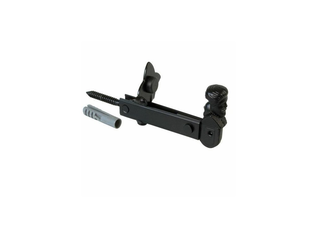 Uzávěr okenice model 6 z odbojem, španělské firmy AMIG - Materiál: ocel a zamak - Povrchová úprava: černá matowa pryskyřice epoksydowa - Dostarczany z montážní hmoždinkou - Ruchoma ozdobna hlavice, z jednej strony twarz mužský, z drugiej twarz kobiety. - Doraz wbudowany w blokaci chroni okenici przed uderzeniami o stěnu Produkt slouží k blokowania křídla okenice w pozycji otwartej. Technický výkresDoplňkové parametry