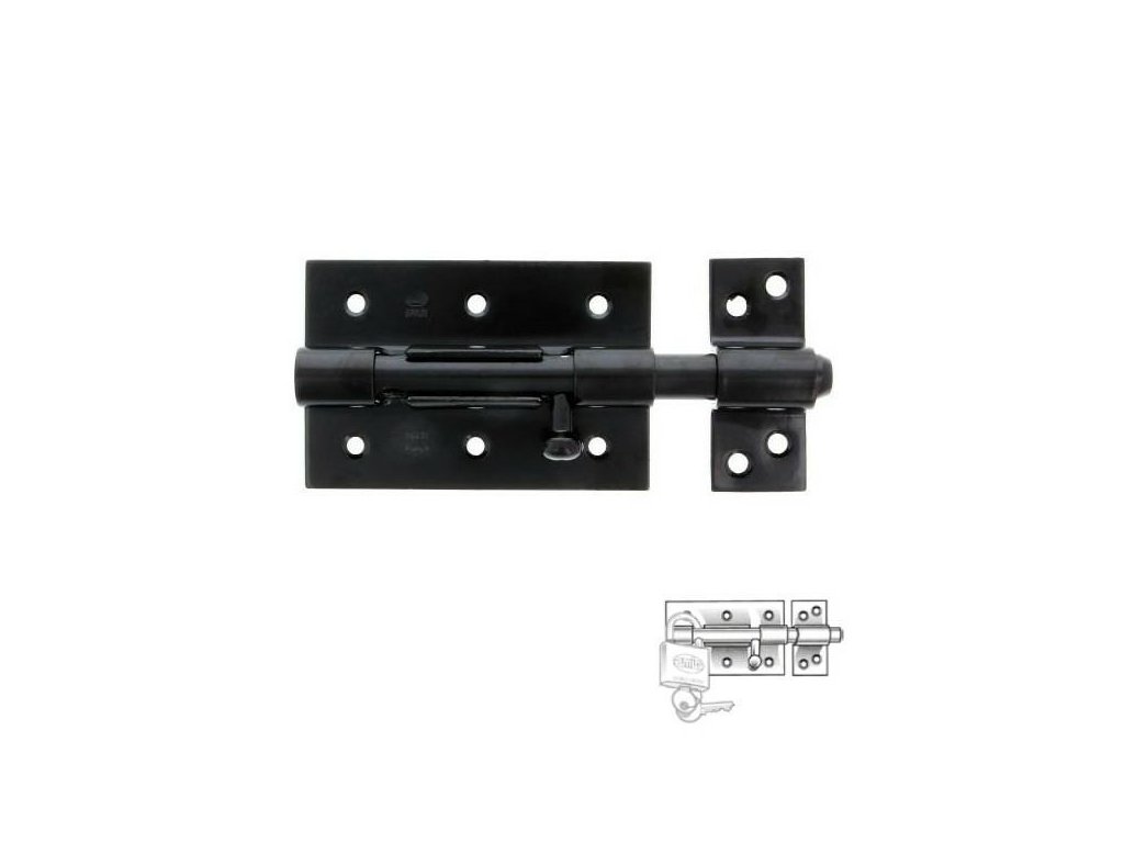 Zástrčka, rygiel, model 454 španělské firmy AMIG - Rozměry podstawy: 100x67mm - Materiál: ocel - Povrchová: černá epoksydowana - Z otworem na kłódkę - Podstawa z 6-cioma otworami - Wysuw bolca: 46mm Zobacz výkres technickýDoplňkové parametry