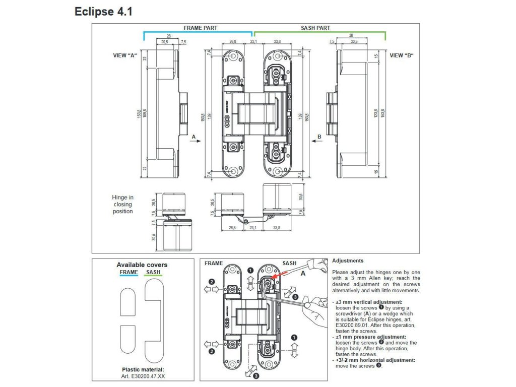Závěs dveřní skrytý ECLIPSE 4.1 - Výška závěsu: 153,8mm - Šířka křidélka části rámové: 26,8mm - Šířka křidélka části křídlové: 33,8mm - Hloubka části rámové: 28mm - Hloubka části křídlové: 38mm - Materiál: zamak - Barva: chrom mat - Nosnost: 50 kg na 2 závěsech - Krytky dostupné v oddzielnej prodeje Odwracalny skrytý závěs. Je regulovaný v 3 osách Rozsah otevření dveře od 0° pro 180° Hodí se pro dveře o tloušťky větší nebo stejné 44 mm. Idealny pro použití z krytkou pro 13 mm. Viz výkres technickýDoplňkové parametry