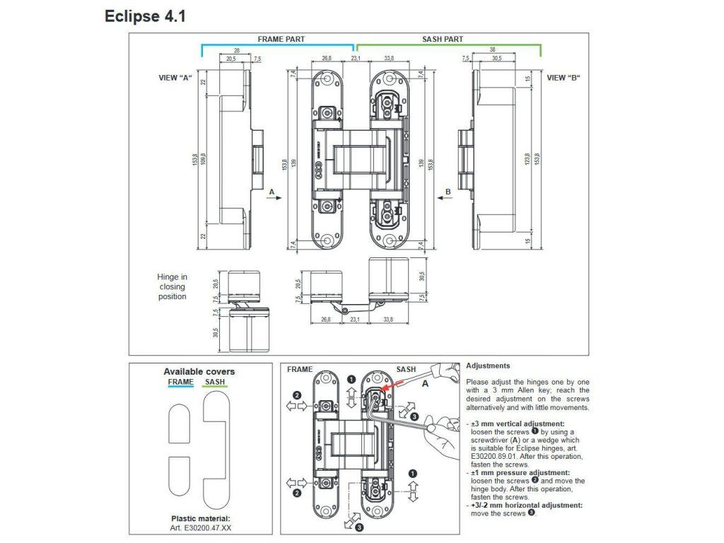 Dveřní pant ukryty ECLIPSE 4.1 - Výška pantu: 153,8mm - Šířka křídla části ramowej: 26,8mm - Šířka křídla části křídlowej: 33,8mm - Hloubka rámové části: 28mm - Hloubka části křídlowej: 38mm - Materiál: zamak - Barva: mosazný - Nosnost: 50 kg na 2 pantach - Krytky dostupné w oddzielnej sprzedaży Odwracalny ukryty pant. Jest regulowany w 3 osiach Zakres otwarcia dveří od 0° do 180° Nadaje se do dveří o tloušťce větší lub równej 44 mm. Idealny do zastosowań z krytem do 13 mm. Viz technický výkresDoplňkové parametry